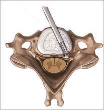 经皮内窥镜激光颈椎间盘摘除术的治疗对象是软性颈椎间盘突出症,患者的髓核从撕裂的纤维环流出,压迫到肩和上肢神经。